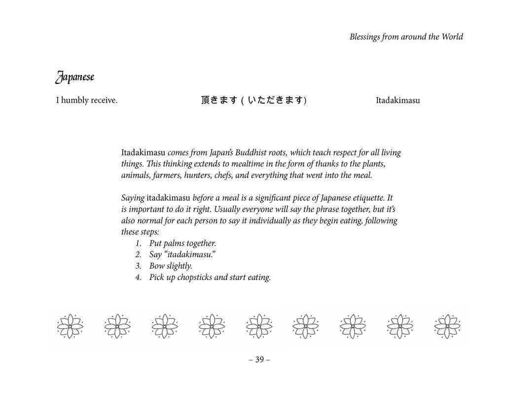 Here is a robust, beautiful collection of verses, songs, and prayers in various languages with sentiments of recognition and gratitude for the food we eat! Keep it on the table and travel worldwide to experience all the lovely, humble ways that families pause before "digging in'' to remember the work and the gift that our nourishment brings - countless gestures of "grace" before a meal! It is a blessing to remember how lucky we are to have the food we eat and to remember those who grow it for us and the earth itself for providing it for us. This little treasure promises to become a favorite for the whole family.